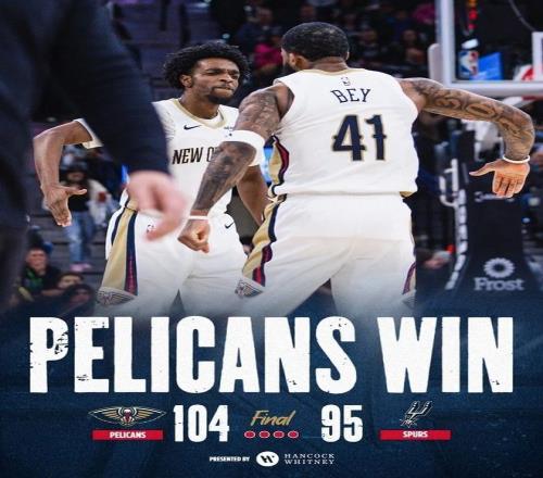 鹈鹕10495力克马刺,锡安威廉森24+10,文班亚马16+16